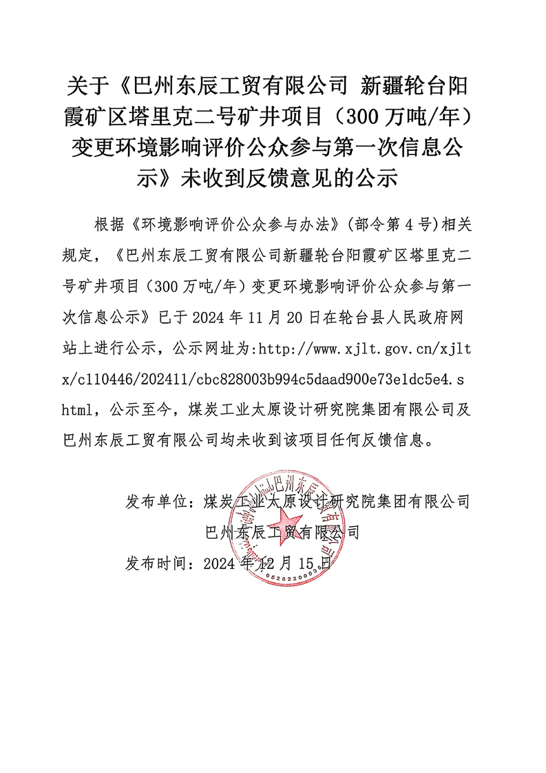 《巴州东辰工贸有限公司 新疆轮台阳霞矿区塔里克二号矿井项目(300万吨/年)变更环境影响评价公众参与第一次信息公示》未收到反馈意见的公示