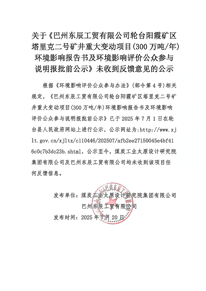 《巴州东辰工贸有限公司轮台阳霞矿区塔里克二号矿井重大变动项目(300万吨/年)环境影响报告书及环境影响评价公众参与说明报批前公示》未收到反馈意见的公示