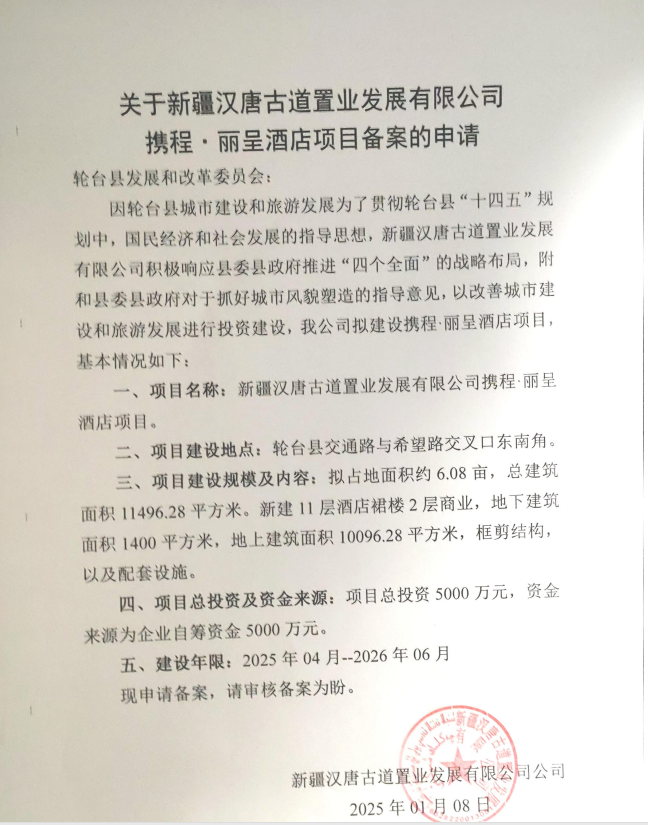 关于新疆汉唐古道置业发展有限公司携程·丽呈酒店项目备案的申请