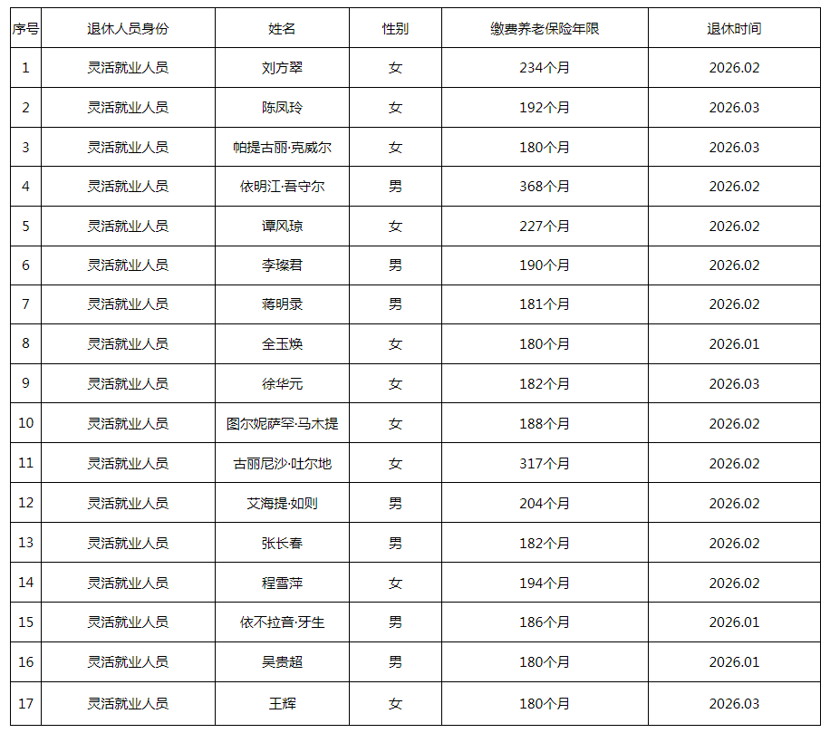 根据参保职工退休审批管理工作要求,现对2026年1月-3月轮台县灵活就业人员退休情况进行公示。公示时间:2026年1月20日至2026年1月26日。公示期内,如发现与公示情况不符的,可拨打以下电话反映: