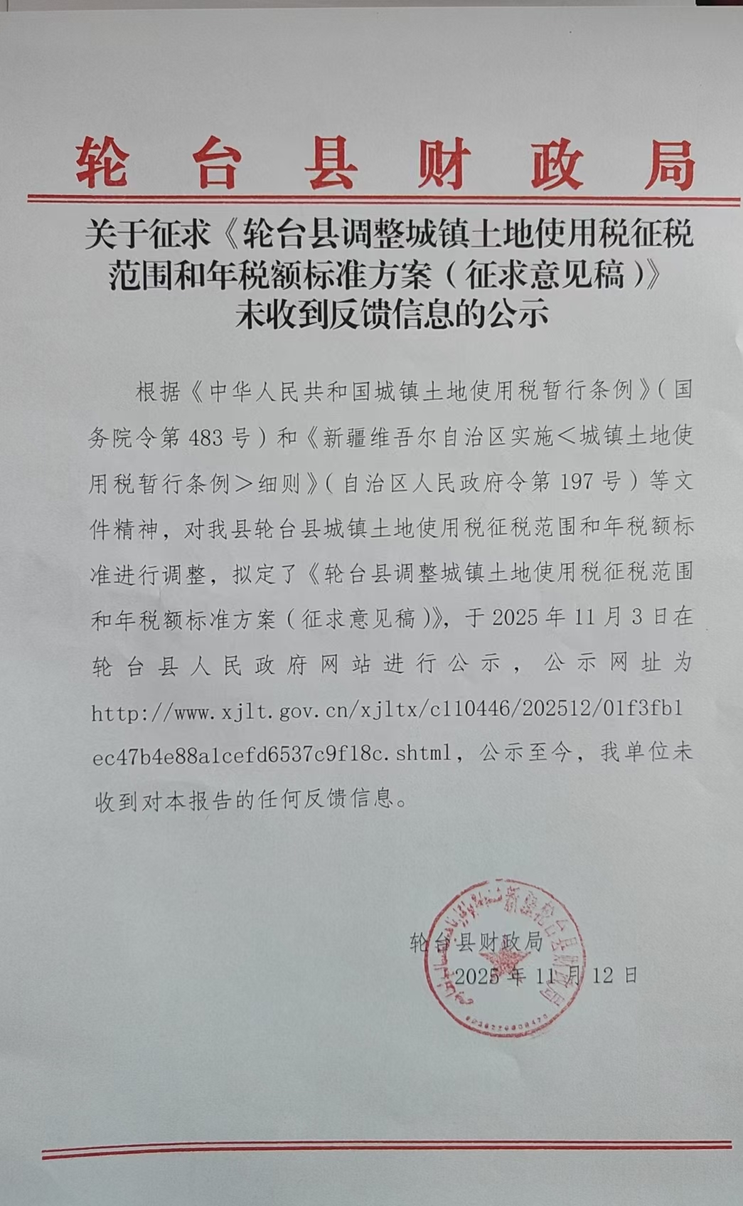 关于征求《轮台县调整城镇土地使用税征税范围和年税额标准方案(征求意见稿)》未收到反馈信息的公示