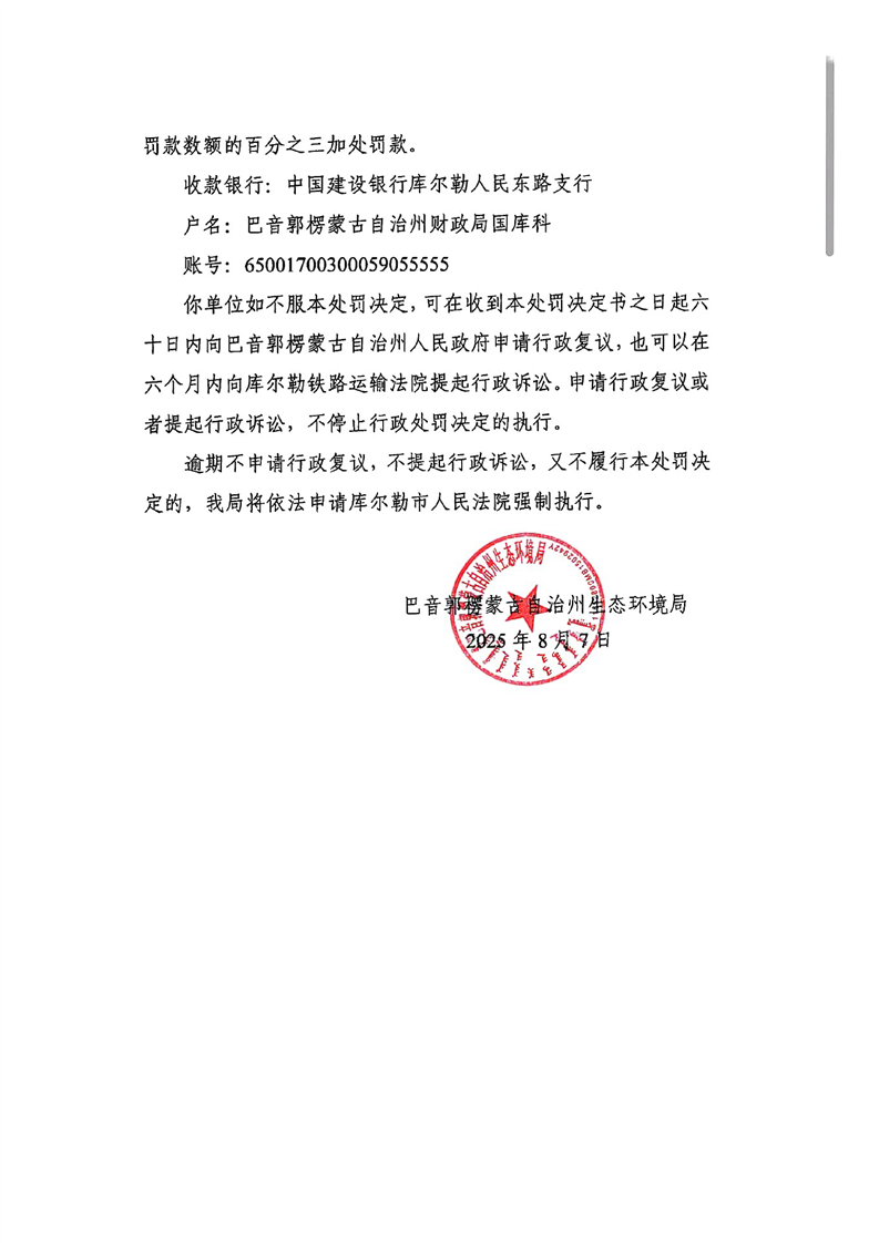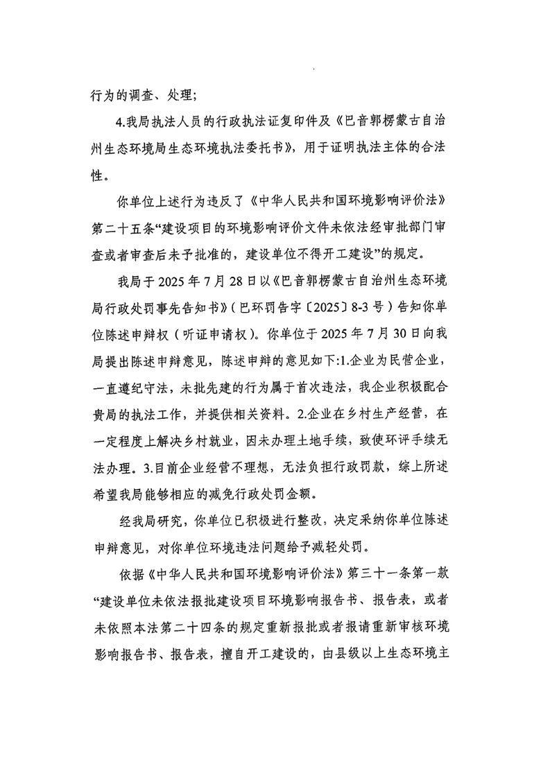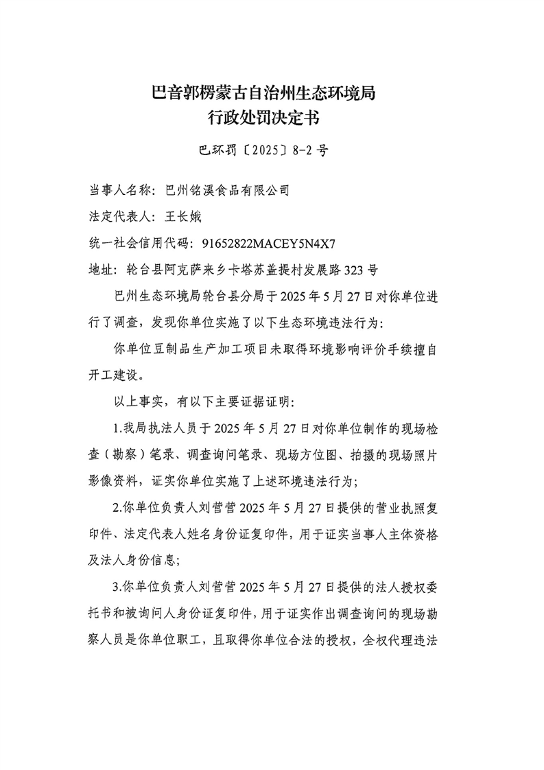 巴州铭溪食品有限公司行政处罚决定书(巴环罚〔2025〕8-2号)