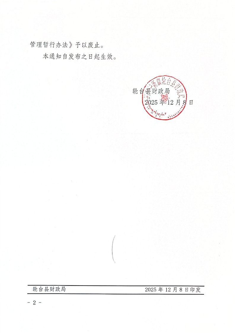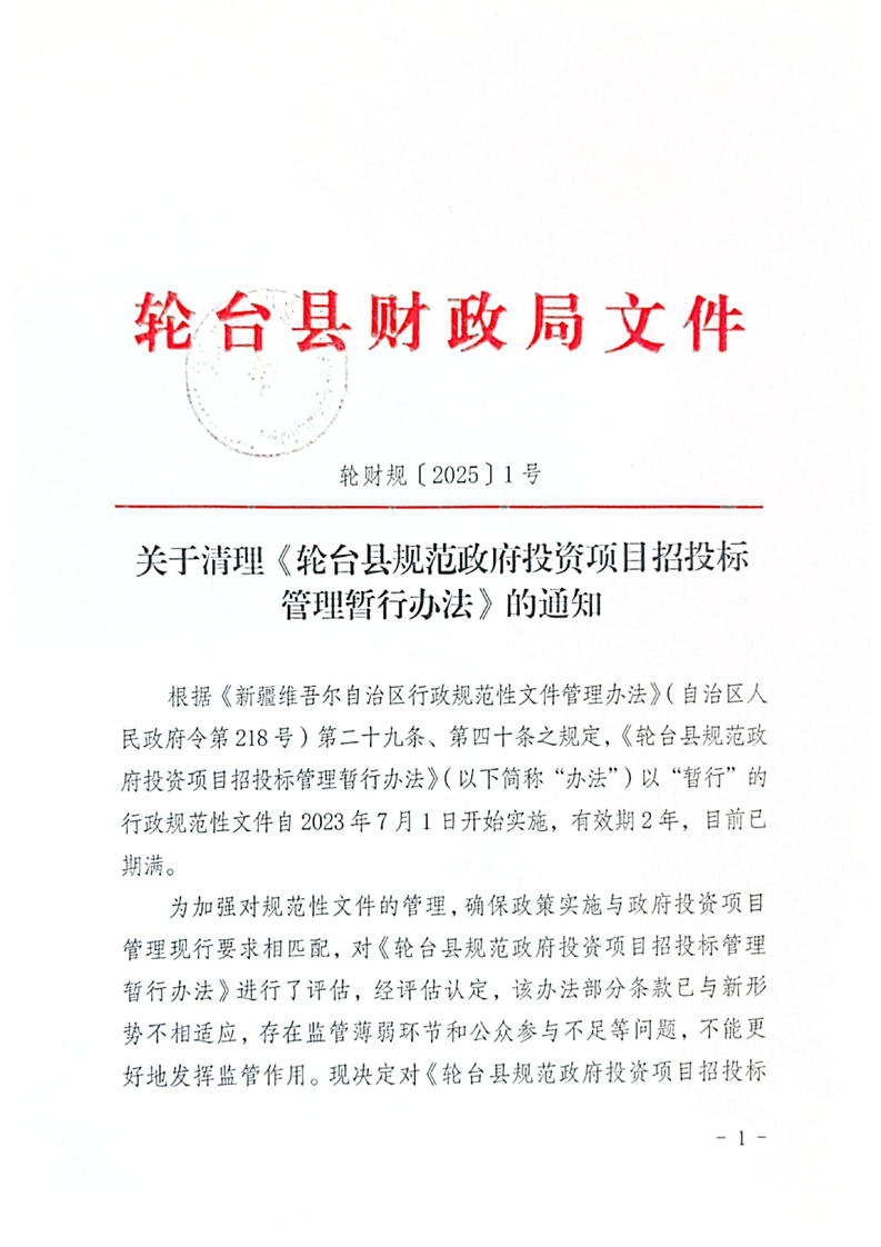 索引号:754589229/2025-00367 文号:轮财规〔2025〕1号 发布机构:县财政局 成文日期:2025/12/08 18:12 发布日期:2025/12/08 18:12 有效性:有效 名称:关于清理《轮台县规范政府投资项目招投标管理暂行办法》的通知